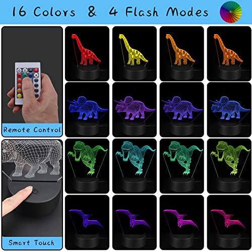 - 🦕【Remote Control & Smart Touch】This dinosaur toy night light for boys is designed for kids to learn and have fun. You can control the 3D lamp with the remote control or the smart touch button on the base. Choose any color and mode you like in 16 single colors static modes and 4 dynamic modes. You can easily change the variety of dinosaur visual effects even when lying in bed.