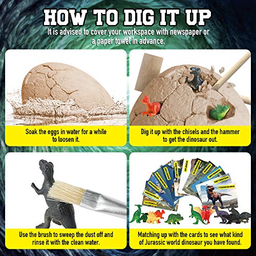 - HOW TO DIG IT UP: To get a little messy with the dino eggs dig kit, I would suggest you put some table cloths on the table first or do it outside. To soak the dinosaur dig eggs in water in 10mins, excavate them with the chisels and hammers, sweep the dust off with the brush. Then rinse the dinosaur with clean water, a cute and beautiful toy you will get! To play with the toys and learn with the identification cards, to see what kind of Jurassic world dinosaur the kids found.